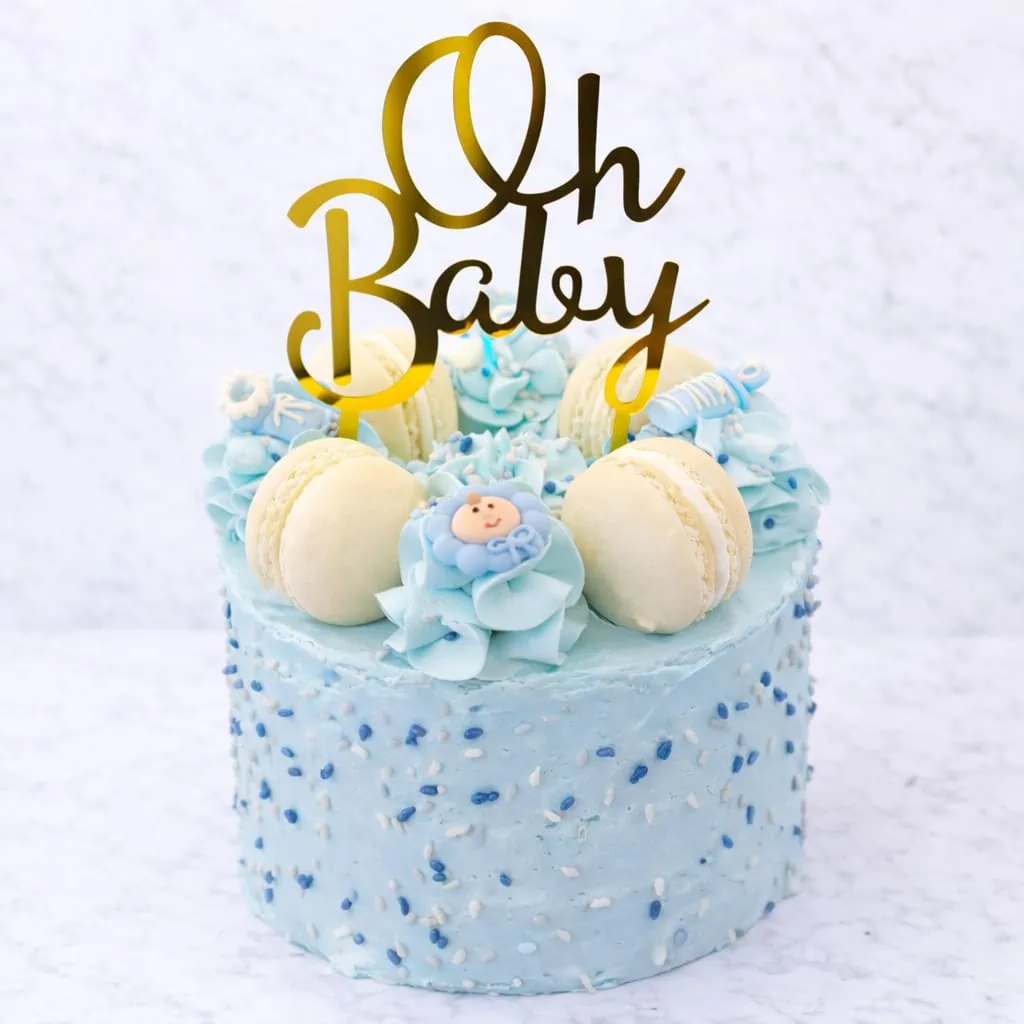 Celebrate a new arrival with our delightful Blue Baby Shower Vanilla Layer Cake. This exquisite cake features soft vanilla layers filled with a luscious strawberry and vanilla cream, promising a taste as sweet as the occasion. The cake is elegantly decorated with charming baby-themed sugar decorations, traditional blue muisjes, and a “Oh Baby” gold topper that adds a touch of elegance and joy. With a 15 cm diameter, it comfortably serves 9-12 guests, making it ideal for intimate gatherings and special moments.