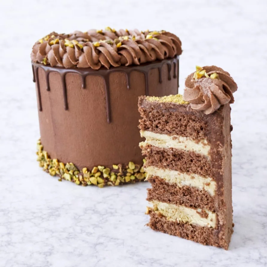 This exquisite cake features three layers of moist, dark chocolate sponge, baked to perfection and infused with premium cocoa for an intense, sophisticated flavour. Between each layer lies a generous filling of creamy pistachio cream, adding a subtle nutty contrast that perfectly complements the chocolate’s depth.