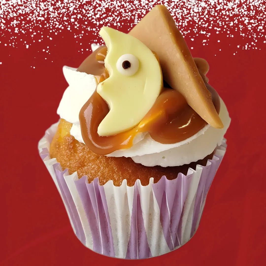 The cupcake is topped with a generous swirl of smooth vanilla buttercream and drenched in a luscious layer of homemade salted caramel, creating the perfect balance of creamy sweetness and a hint of savoury depth. To highlight the festive spirit, each cupcake is adorned with delightful Sinterklaas-themed chocolate decorations — including a cheerful white chocolate moon and a caramel-flavoured chocolate shard — adding both flavour and visual charm.