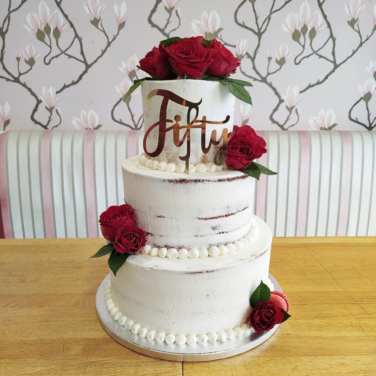 Our Tiered Semi Naked Wedding Cake offers a chic, understated elegance with its two or three-tier design, each composed of four layers of delicious cake. The cake features a thin layer of frosting, allowing the texture of the cake to peek through. Choose from a Vanilla cake with a delightful strawberry and cream cheese filling or a rich Red Velvet option. Customize your cake with optional non-edible pink or white flower decorations and macarons for an extra touch of beauty and sophistication.
